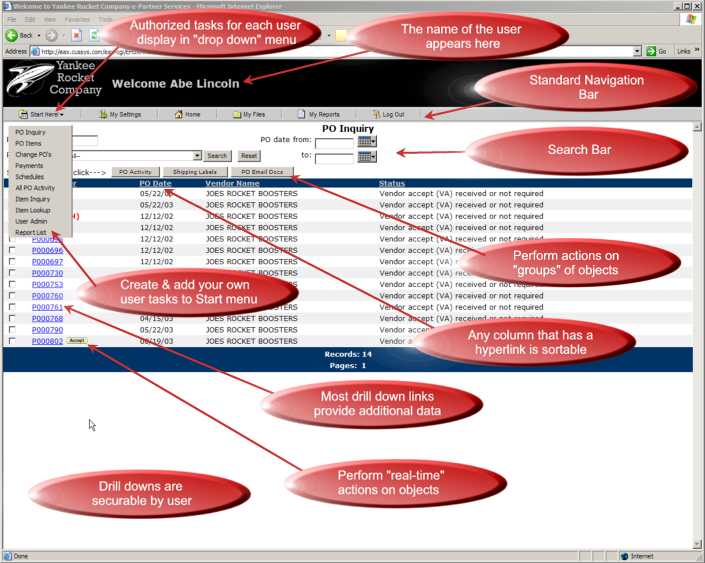 Your company is the Yankee Rocket Company, the largest manufacturer and distributor of model rockets in the United States. Your biggest supplier is Rocket Boosters, Inc.. The customer service representative at Joe's Rocket Boosters is a hard working fellow by the name of Abe Lincoln. You have given him access to his customer orders with you on your system (i.e. your purchase orders) via EAX. When he logs on via the new Vendor Service link on The Yankee Rocket Company corporate website, he is prompted for, and enters his sign-on and password. He is securely routed to a Welcome screen that displays a "menu" of the tasks he has been authorized to execute. From that menu, as shown in the example below he has selected "PO Inquiry". The data that he sees is "real time", exactly as it exists at that moment in the data base of your iSeries 400.
